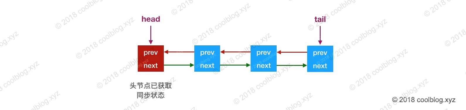 当头结点释放同步状态后,且后继节点对应的线程被阻塞,此时头结点线程将会去唤醒后继节点线程。后继节点线程恢复运行并获取同步状态后,会将旧的头结点从队列中移除,并将自己设为头结点。大致示意图如下: